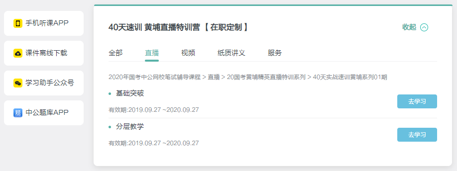 電腦端查看直播安排時,通過查看直播課列表,找到階段課程后,點擊“去學習”查看直播時間及內(nèi)容。詳見下圖