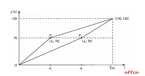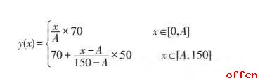 舉例來說,設兩個科目的合格分數線分別為 A1和 A2,則轉換分 y(x) 關于原始成績x的函數圖像,如下圖所示: