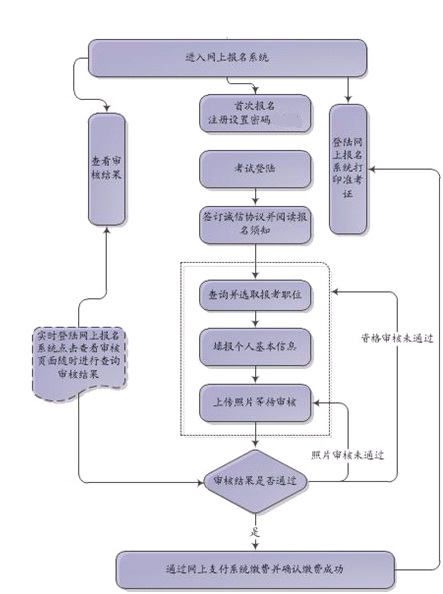 登錄報名網(wǎng)站—>閱讀并同意考生誠信承諾—>進入報名界面按報名系統(tǒng)提示填寫報名信息—>上傳近期清晰免冠電子照片—>等待報名資格審核—>審核通過后網(wǎng)上繳費。