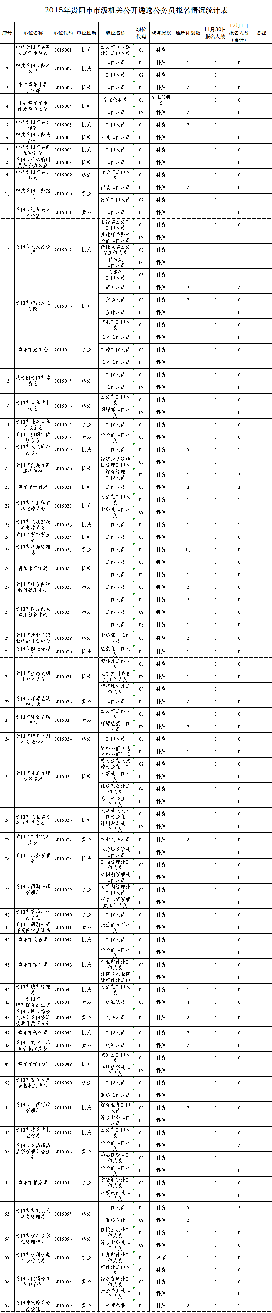 2015貴州貴陽市級(jí)機(jī)關(guān)公務(wù)員遴選報(bào)名情況統(tǒng)計(jì)表(12月1日)