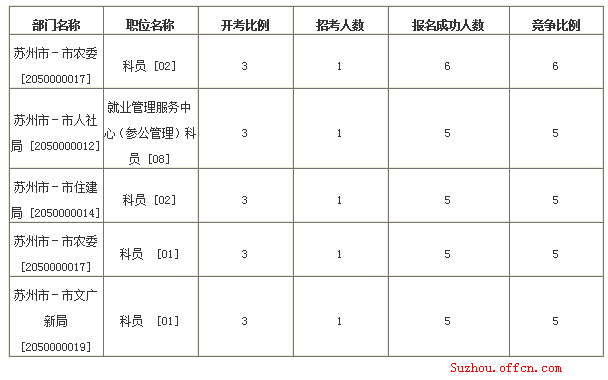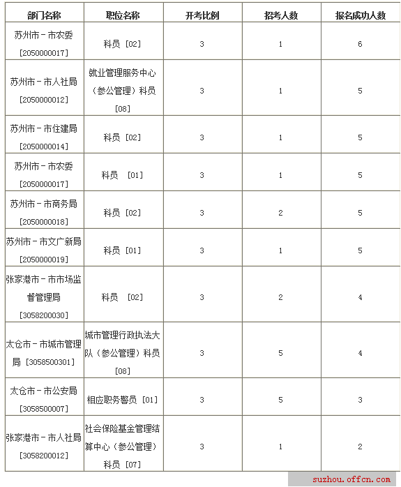 截至11日16時,蘇州市報名人數(shù)最多的職位為:蘇州市市農(nóng)委科員[02],一共有6人報名,競爭最激烈的職位也是蘇州市市農(nóng)委科員[02],招錄1人,報名人數(shù)為6人,報名通過審核人數(shù)前十的職位主要集中在蘇州市人社局和市農(nóng)委 、張家港市場監(jiān)督管理局、太倉城市管理局等部門,具體信息如下: