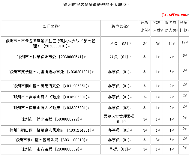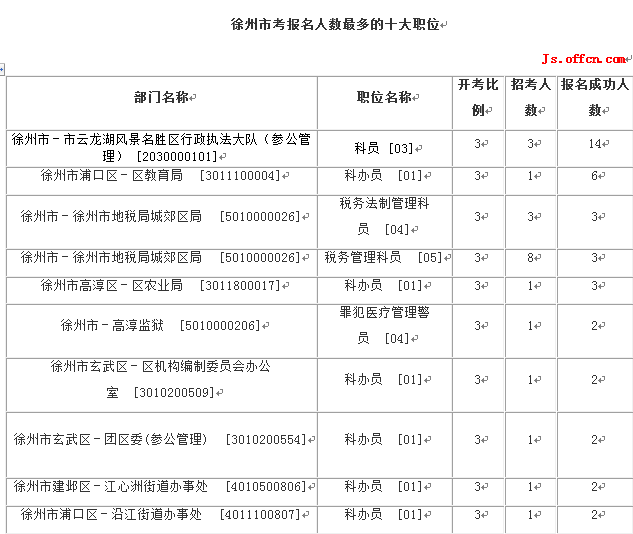 截至11日16時,徐州市報名人數(shù)最多的職位為:科辦員 [03],一共有14人報名,競爭最激烈的職位為科辦員 [03],招錄3人,報名人數(shù)為14人,報名通過審核人數(shù)前十的職位主要集中在徐州市-市云龍湖風景名勝區(qū)行政執(zhí)法大隊(參公管理)[2030000101]、徐州市-民革徐州市委 [2030000541],具體信息如下: