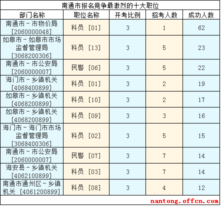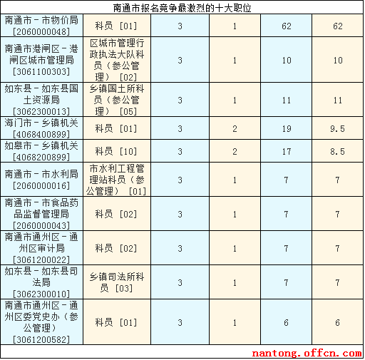 截至11日16時,南通市報名人數(shù)最多的職位為:科員 [01],一共有62人報名,競爭最激烈的職位為也是這個報名最多的科員[01],招錄1人,報名人數(shù)為62人,報名通過審核人數(shù)前十的職位比較集中,主要是南通市區(qū)和如皋市,如南通市-市物價局[2060000048]、如皋市-如皋市市場監(jiān)督管理局[3068200306],具體信息如下: