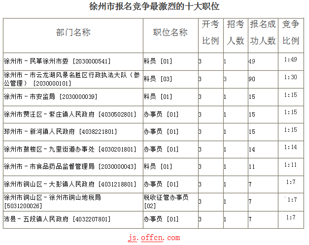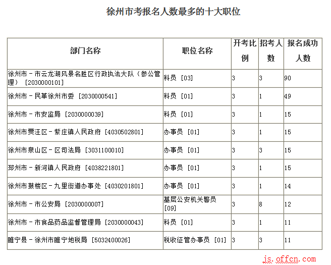 截至12日16時(shí),徐州市報(bào)名人數(shù)最多的職位為:科辦員 [03],一共有90人報(bào)名,競(jìng)爭(zhēng)最激烈的職位為科辦員 [03],招錄3人,報(bào)名人數(shù)為90人,報(bào)名通過(guò)審核人數(shù)前十的職位主要集中在徐州市-市云龍湖風(fēng)景名勝區(qū)行政執(zhí)法大隊(duì)(參公管理)[2030000101]、徐州市-民革徐州市委 [2030000541],具體信息如下: