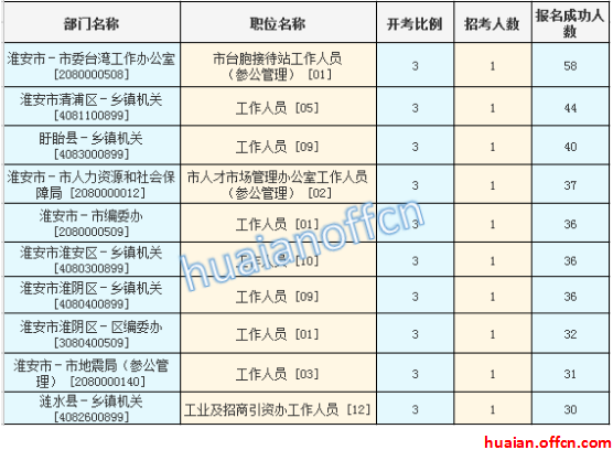 截至14日16時,淮安市報名人數(shù)最多的職位為:工作人員 [09],一共有59人報名,競爭最激烈的職位為市臺胞接待站工作人員(參公管理)[01],招錄1人,報名人數(shù)為58人,報名通過審核人數(shù)前十的職位主要集中在淮安市淮安區(qū)-鄉(xiāng)鎮(zhèn)機關 [4080300899]、淮安市-市委臺灣工作辦公室 [2080000508],具體信息如下:
