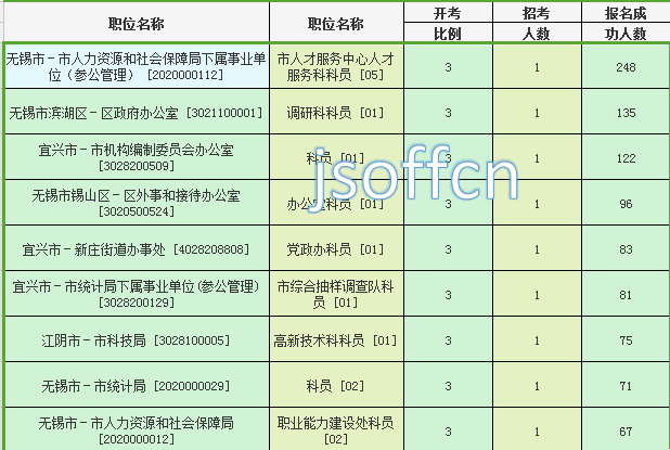 截至16日16時(shí),無(wú)錫市報(bào)名人數(shù)最多的職位為:無(wú)錫市-市人力資源和社會(huì)局下屬事業(yè)單位(參公管理) [2020000112],市人才服務(wù)中心人才服務(wù)科科員 [05],一共有135人報(bào)名,報(bào)名通過(guò)審核人數(shù)前五的職位主要集中在: 無(wú)錫市-市人力資源和社會(huì)局下屬事業(yè)單位(參公管理) [2020000112]、無(wú)錫市濱湖區(qū)-區(qū)政府辦公室 [3021100001]、宜興市-無(wú)錫市宜興地稅局 [5028200026]、無(wú)錫市濱湖區(qū)-區(qū)政府辦公室 [3021100001]、宜興市-市機(jī)構(gòu)編制委員會(huì)辦公室 [3028200509]等十大職位,截止今天報(bào)名最多和競(jìng)爭(zhēng)最激烈的職位依然是無(wú)錫市-市人力資源和社會(huì)局下屬事業(yè)單位(參公管理) [2020000112],競(jìng)爭(zhēng)比例達(dá)到1:248,多個(gè)職位報(bào)名人數(shù)三位數(shù),但依然有5個(gè)職位無(wú)人報(bào)名。