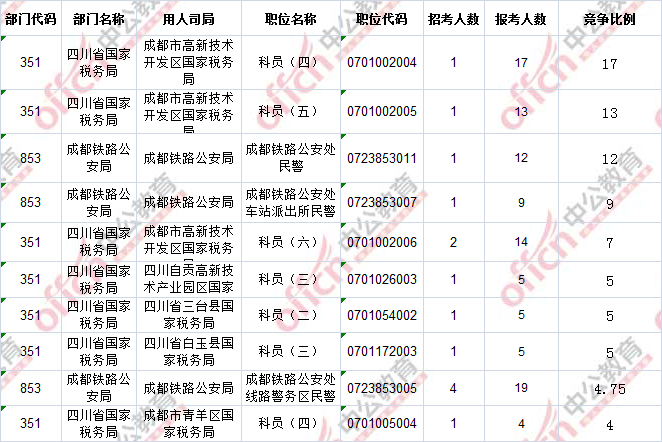 截止到15日16時,競爭比例的職位為‘四川省國家稅務局成都市高新技術(shù)開發(fā)區(qū)國家稅務局’一職,招錄1人,截止到15日16時通過人數(shù)為17人。