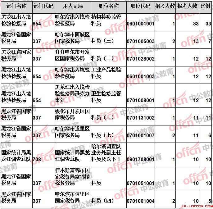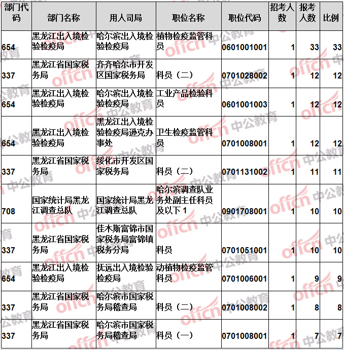 報(bào)名通過(guò)審核人數(shù)前十的職位主要集中在黑龍江出入境檢驗(yàn)檢疫局、黑龍江省國(guó)家稅務(wù)局、國(guó)家統(tǒng)計(jì)局黑龍江調(diào)查總隊(duì)等部門(mén),具體信息如下: