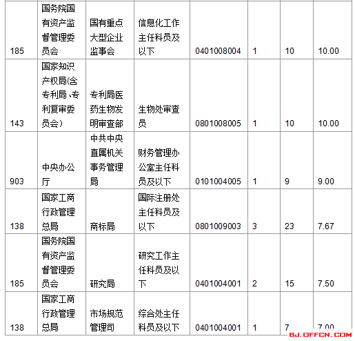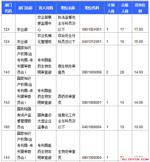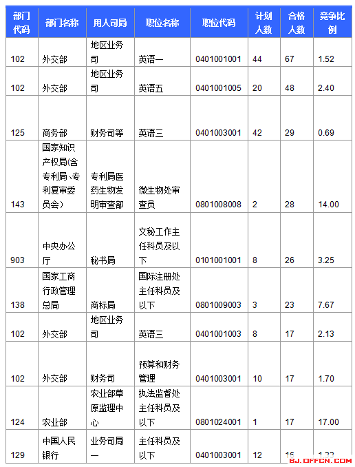 截止到15日16時(shí),競(jìng)爭(zhēng)比例的職位為農(nóng)業(yè)部農(nóng)業(yè)部草原監(jiān)理中心一職,招錄1人,截止到15日16時(shí)通過人數(shù)為17人,報(bào)名通過審核人數(shù)前十的職位主要集中在外交部、商務(wù)部、國(guó)家知識(shí)產(chǎn)權(quán)局(含專利局、專利復(fù)審委員會(huì))等部門,具體信息如下: