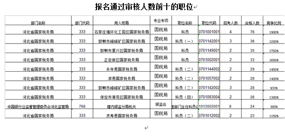 報名通過審核人數(shù)前十的職位主要集中在河北省國家稅務局、中國銀行業(yè)監(jiān)督管理委員會河北監(jiān)管局、中央辦公廳等部門,具體信息如下: