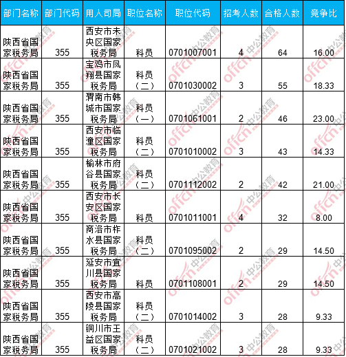 報(bào)名通過審核人數(shù)前十的職位主要集中在陜西省國家稅務(wù)局以及陜西出入境檢驗(yàn)檢疫局這兩個(gè)部門,具體信息如下: