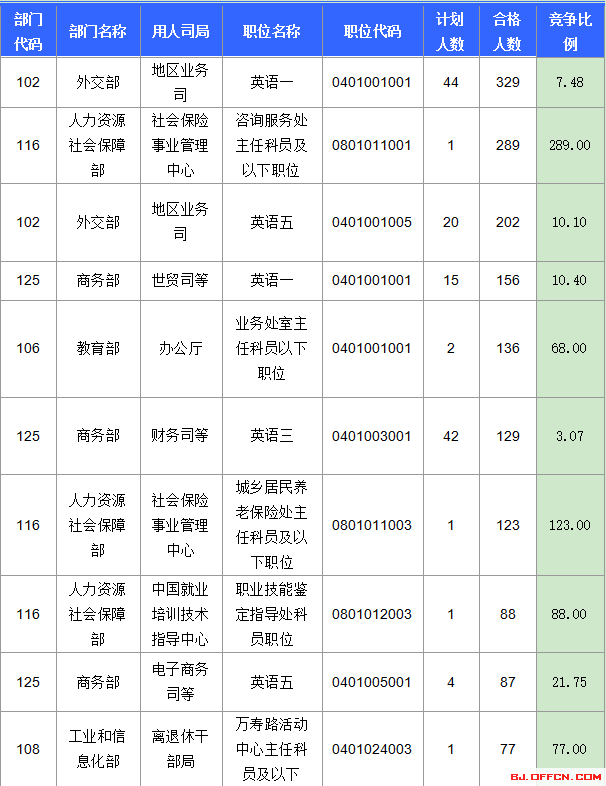 合格人數(shù)前十的職位主要集中在外交部、人力資源社會局、商務部等部門,具體信息如下:
