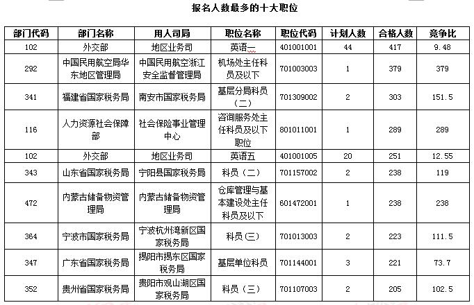 從今日8時(shí)數(shù)據(jù)來(lái)看,競(jìng)爭(zhēng)最激烈的職位為中國(guó)民用航空局華東地區(qū)管理局中國(guó)民用航空浙江安全監(jiān)督管理局機(jī)場(chǎng)處主任科員及以下(職位代碼701003003),競(jìng)爭(zhēng)比379:1。從下表可以看出,目前競(jìng)爭(zhēng)最激烈的十個(gè)職位除了人力資源部一個(gè)職位屬于中央職位以外,其余全部來(lái)自市以下職位,而當(dāng)中有6個(gè)來(lái)自各省國(guó)稅局的職位,2個(gè)職位來(lái)自物資管理系統(tǒng),這也能看出考生對(duì)于這兩個(gè)系統(tǒng)的喜愛(ài)。從職位條件來(lái)看,這十個(gè)職位對(duì)于基層工作經(jīng)驗(yàn)全部沒(méi)有要求,尤其可見(jiàn),這一條件對(duì)于大部分應(yīng)屆生來(lái)說(shuō)是一個(gè)門檻,作為國(guó)考報(bào)考的主力大軍來(lái)說(shuō),中公網(wǎng)校專家建議,廣大應(yīng)屆生應(yīng)該更多關(guān)注基層職位,很多基層職位也是很好的選擇。