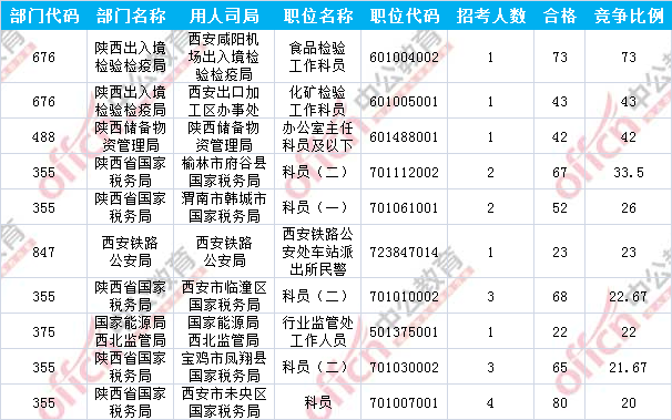 截止到17日8時,競爭比例的職位為陜西出入境檢驗檢疫局西安咸陽機場出入境檢驗檢疫局食品檢驗工作科員一職,招錄1人,截止到17日8時通過人數(shù)為73人。