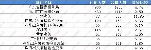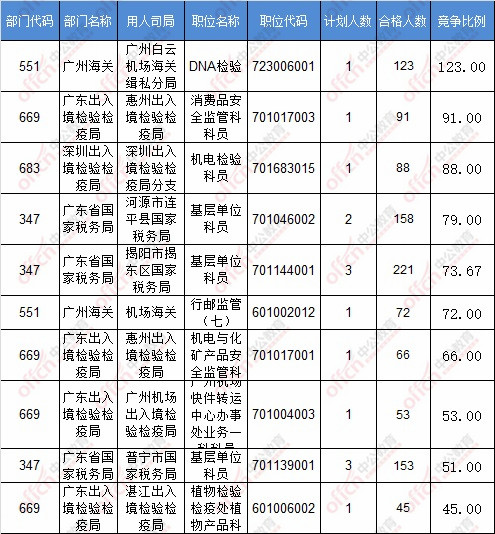 報(bào)名通過(guò)審核人數(shù)前十的職位主要集中在廣州海關(guān)、廣東出入境檢驗(yàn)檢疫局、深圳出入境檢驗(yàn)檢疫局等部門,具體信息如下: