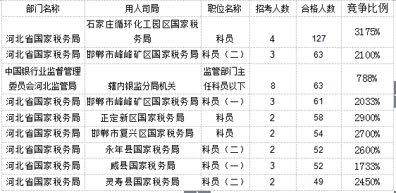 報名通過審核人數前十的職位主要集中在河北省國家稅務局、國家統(tǒng)計局河北調查總隊、中央辦公廳等部門,具體信息如下: