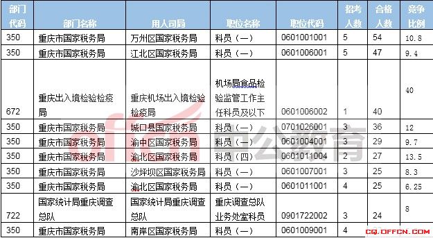 截止到15日16時,競爭比例的職位為‘重慶出入境檢驗檢疫局’一職,招錄1人,截止到17日8時通過人數(shù)為40人。