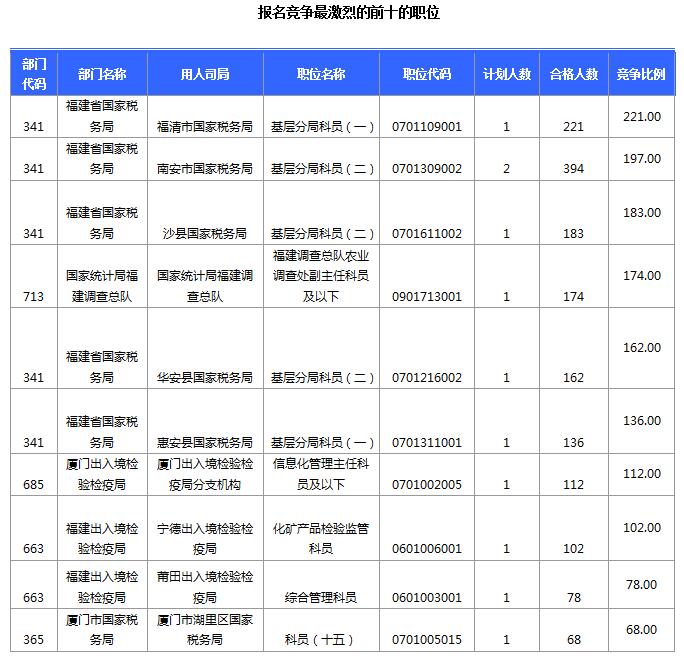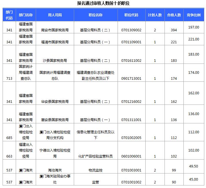報名通過審核人數(shù)前十的職位主要集中在南安市國家稅務(wù)局、福清市國家稅務(wù)局、沙縣國家稅務(wù)局等部門,具體信息如下: