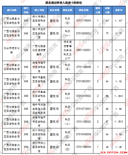 報名通過審核人數(shù)前十的職位主要集中在廣西壯族自治區(qū)國家稅務(wù)局、工業(yè)和信息化部等部門,具體信息如下: