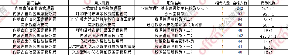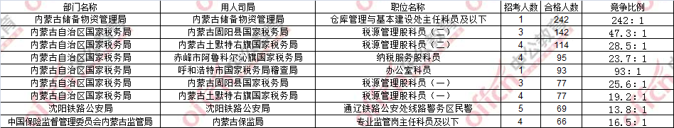 報(bào)名通過(guò)審核人數(shù)前十的職位主要集中在內(nèi)蒙古儲(chǔ)備物資管理局、內(nèi)蒙古固陽(yáng)縣國(guó)家稅務(wù)局、內(nèi)蒙古土默特右旗國(guó)家稅務(wù)局等部門(mén),具體信息如下: