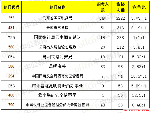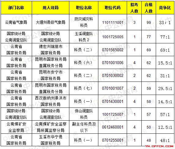 報(bào)名通過審核人數(shù)前十的職位主要集中在云南省氣象局、國家統(tǒng)計(jì)局云南調(diào)查總隊(duì)、云南省國家稅務(wù)局等部門,具體信息如下: