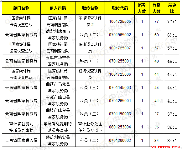 截止17日16時(shí),競爭最激烈的職位為國家統(tǒng)計(jì)局云南調(diào)查總隊(duì)_國家統(tǒng)計(jì)局云南調(diào)查總隊(duì)(玉溪調(diào)查隊(duì)科員2),招錄1人,通過人數(shù)為77人,77:1。