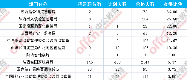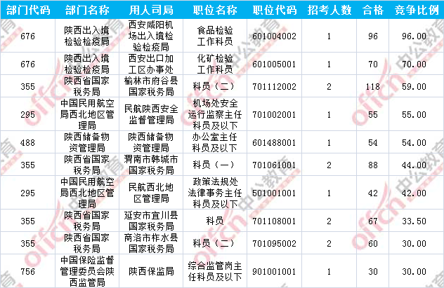 報名通過審核人數(shù)前十的職位主要集中在陜西省國家稅務(wù)局及陜西出入境檢驗檢疫局兩大部門,具體信息如下: