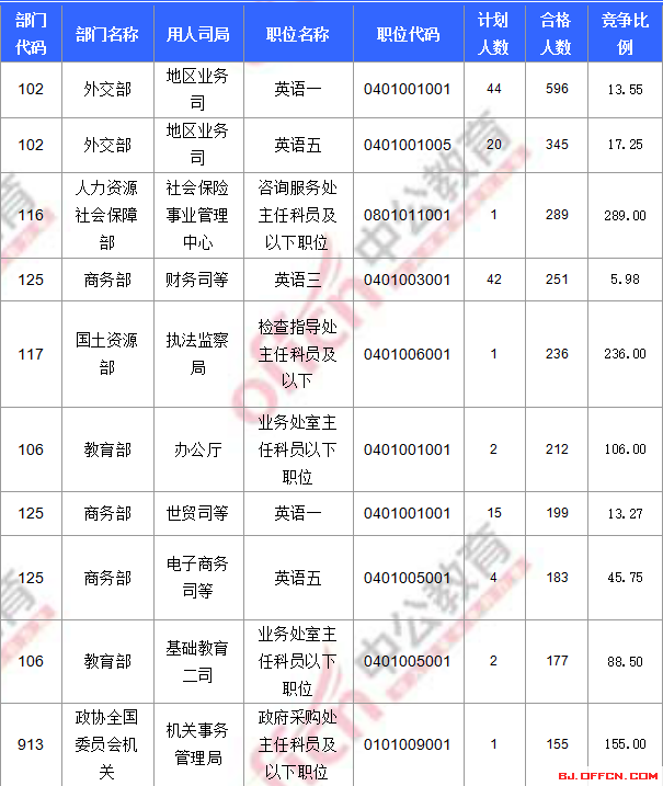 合格人數(shù)前十的職位主要集中在外交部、人力資源社會(huì)部、商務(wù)部等部門,具體信息如下: