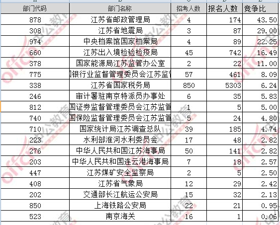 報名通過審核人數(shù)前十的職位主要集中在江蘇省國家稅務(wù)局、中國銀行業(yè)監(jiān)督管理委員會江蘇監(jiān)管局、江蘇出入境檢驗檢疫局,具體信息如下: