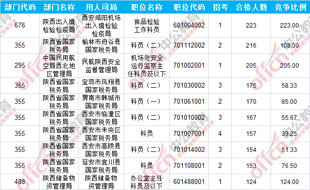 報名通過審核人數(shù)前十的職位主要集中在陜西出入境檢驗檢疫局、陜西省國家稅務局、中國民用航空局西北地區(qū)管理局等部門,具體信息如下: