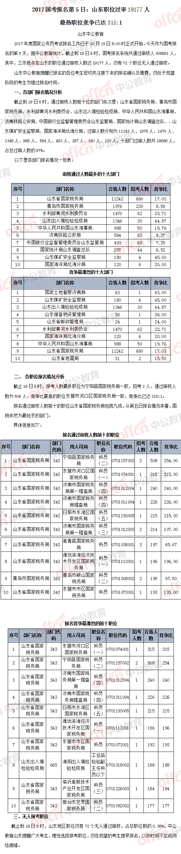 【截至19日8時】2017國考報名山東職位過審19177人 最熱職位競爭已達315:1