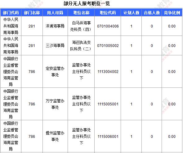 截止到19日8時(shí),工作地點(diǎn)在海南的職位共有27個(gè)無人報(bào)考。海南中公網(wǎng)校提醒廣大考生,多關(guān)注無人報(bào)名職位,會(huì)大大降低競爭。