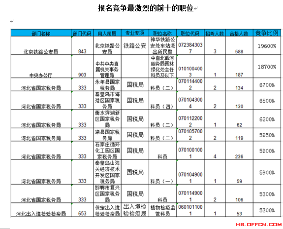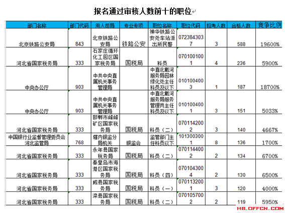 報名通過審核人數(shù)前十的職位主要集中在北京鐵路公安局、河北省國家稅務(wù)局、中央辦公廳等部門,具體信息如下: