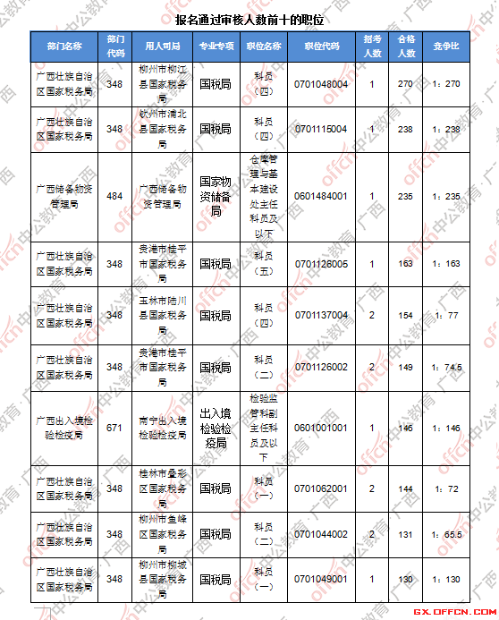 報名通過審核人數(shù)前十的職位主要集中在廣西壯族自治區(qū)國家稅務(wù)局、廣西儲備物資管理局、廣西出入境檢驗檢疫局等部門,具體信息如下: