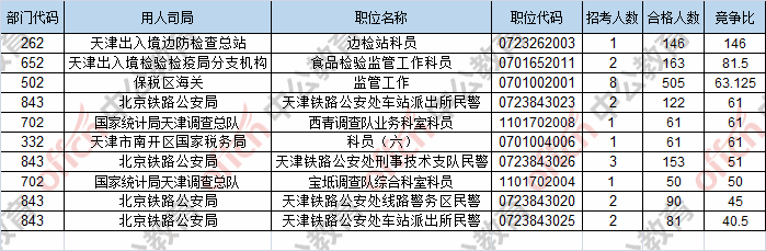 報名通過審核人數(shù)前十的職位主要集中在保稅區(qū)海關(guān)、天津出入境檢驗檢疫局分支機構(gòu)、北京鐵路公安局,具體信息如下:
