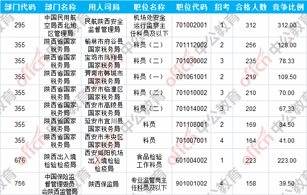 報名通過審核人數(shù)前十的職位主要集中在陜西出入境檢驗檢疫局、陜西省國家稅務(wù)局、中國民用航空局西北地區(qū)管理局等部門,具體信息如下: