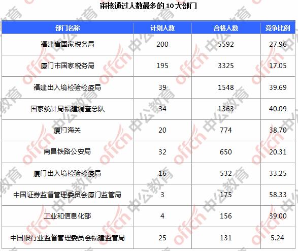 截止到20日8時,通過審核人數(shù)前三位的部門依次是:福建省國家稅務(wù)局、廈門市國家稅務(wù)局、福建出入境檢驗檢疫局,三部門通過審核總?cè)藬?shù)達10465人,占通過審核總?cè)藬?shù)的71.6%。