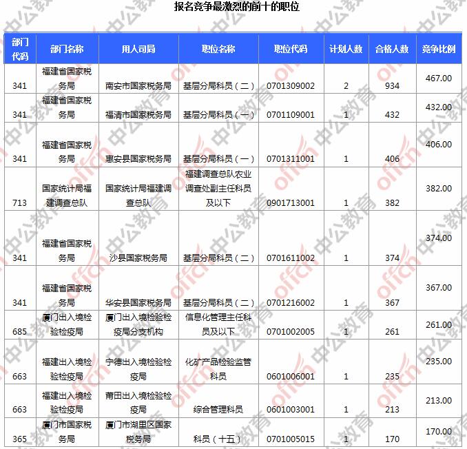 為幫助廣大考生更清晰的了解今日報名情況,福建中公網(wǎng)校整理了審核通過人數(shù)前10位的部門以及競爭比例最激烈的10大部門,供廣大考生參考: