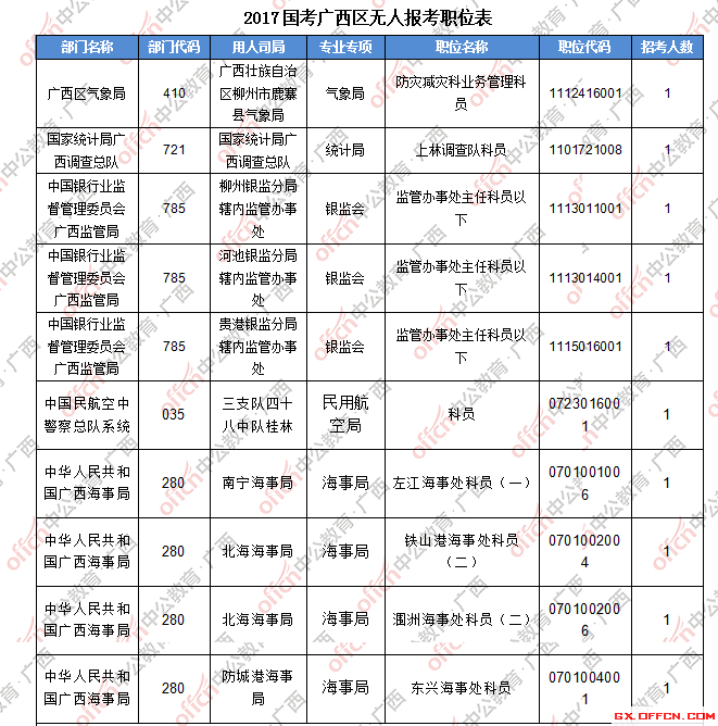 報(bào)名通過(guò)審核人數(shù)前十的職位主要集中在廣西壯族自治區(qū)國(guó)家稅務(wù)局、廣西儲(chǔ)備物資管理局等部門(mén),具體信息如下:
