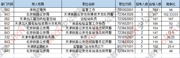 報(bào)名通過審核人數(shù)前十的職位主要集中在保稅區(qū)海關(guān)、北京鐵路公安局、天津出入境邊防檢查總站,具體信息如下: