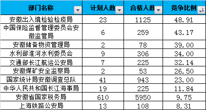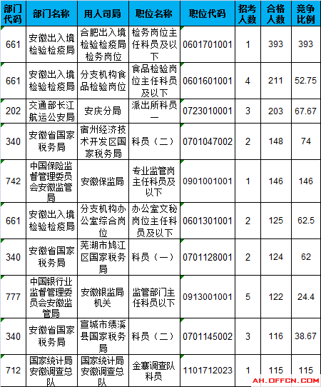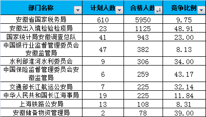 報名通過審核人數(shù)前十的職位主要集中在安徽出入境檢驗檢疫局、交通部長江航運公安局、安徽省國家稅務局等部門,具體信息如下: