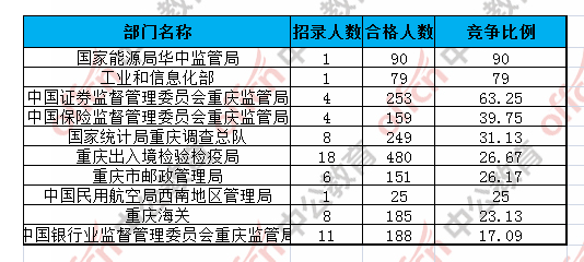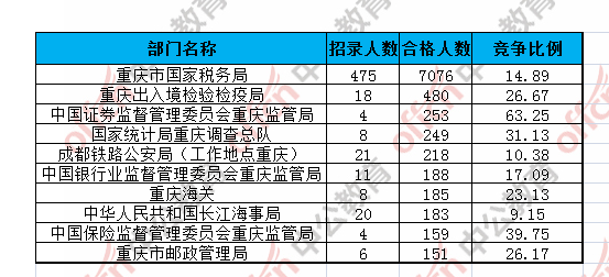 為幫助廣大考生更清晰的了解今日?qǐng)?bào)名情況,重慶中公網(wǎng)校整理了審核通過人數(shù)前十位的部門以及競爭比例最激烈的十大部門,供廣大考生參考: