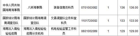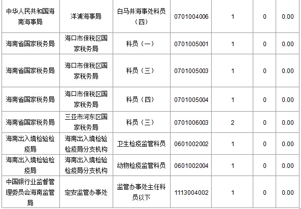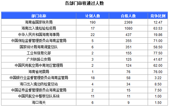 報(bào)名通過審核人數(shù)前十的職位主要集中在海南出入境檢驗(yàn)檢疫局、海南省國(guó)家稅務(wù)局、中華人民共和國(guó)海南海事局等部門,具體信息如下: