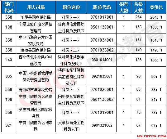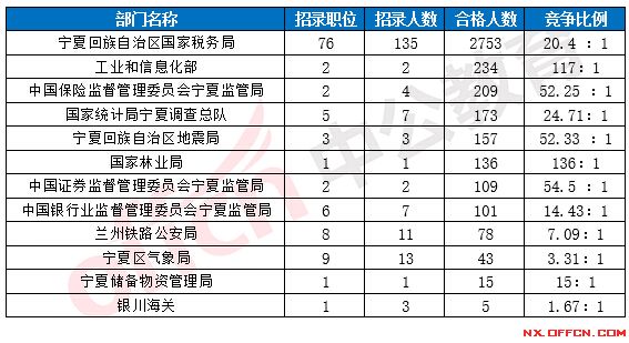 截至21日16時,據(jù)寧夏中公網(wǎng)校統(tǒng)計,2017國考招錄職位中工作地點(diǎn)在寧夏的職位審核合格總?cè)藬?shù)為4013人,共有2個職位無人通過審核,比去年同期報考人數(shù)增加26人,平均競爭比例為25.5:1 。