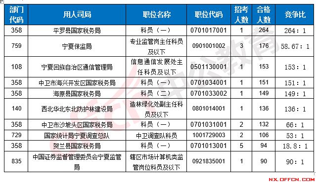 截止到21日16時,競爭比例的職位為平羅縣國家稅務(wù)局科員(一)一職,招錄1人,截止到21日16時合格人數(shù)為264人,具體信息如下:
