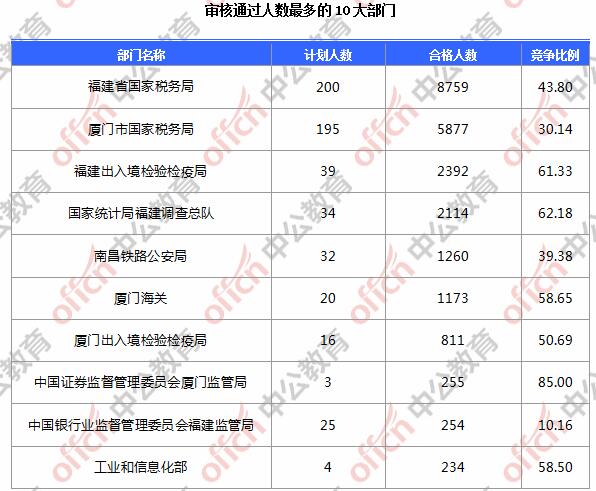 截止到21日16時,通過審核人數(shù)前三位的部門依次是:福建省國家稅務局、廈門市國家稅務局、福建出入境檢驗檢疫局,三部門通過審核總?cè)藬?shù)達17028人,占通過審核總?cè)藬?shù)的72%。
