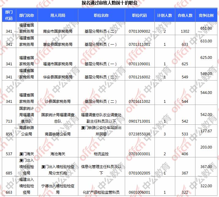 報名通過審核人數(shù)前十的職位主要集中在南安市國家稅務局、惠安縣國家稅務局、福清市國家稅務局等部門,具體信息如下: