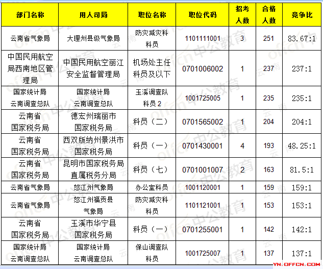 報名通過審核人數(shù)前十的職位主要集中在國家統(tǒng)計局云南調(diào)查總隊、云南省氣象局、云南省國家稅務(wù)局等部門,具體信息如下: