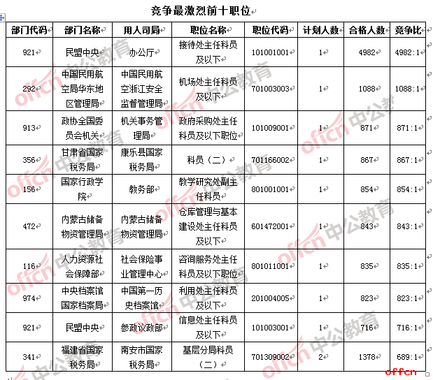 從競爭比上來看,與去年同期只有7個部門超過800:1相比,今年有8個職位“順利過關”。但從整體上來看,今年報考職位的“熱冷兩重天”的特點突顯,最熱職位或可超5000大關,而在競爭比排行榜中排名第二的職位僅1088:1,兩者可謂“天淵之別”。