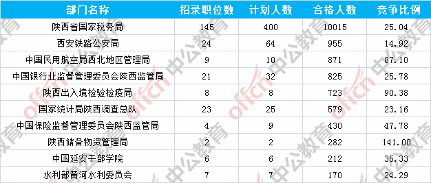 為幫助廣大考生更清晰的了解今日?qǐng)?bào)名情況,陜西中公教育整理了審核通過(guò)人數(shù)前十位的部門(mén)以及競(jìng)爭(zhēng)比例最激烈的十大部門(mén),供廣大考生參考: